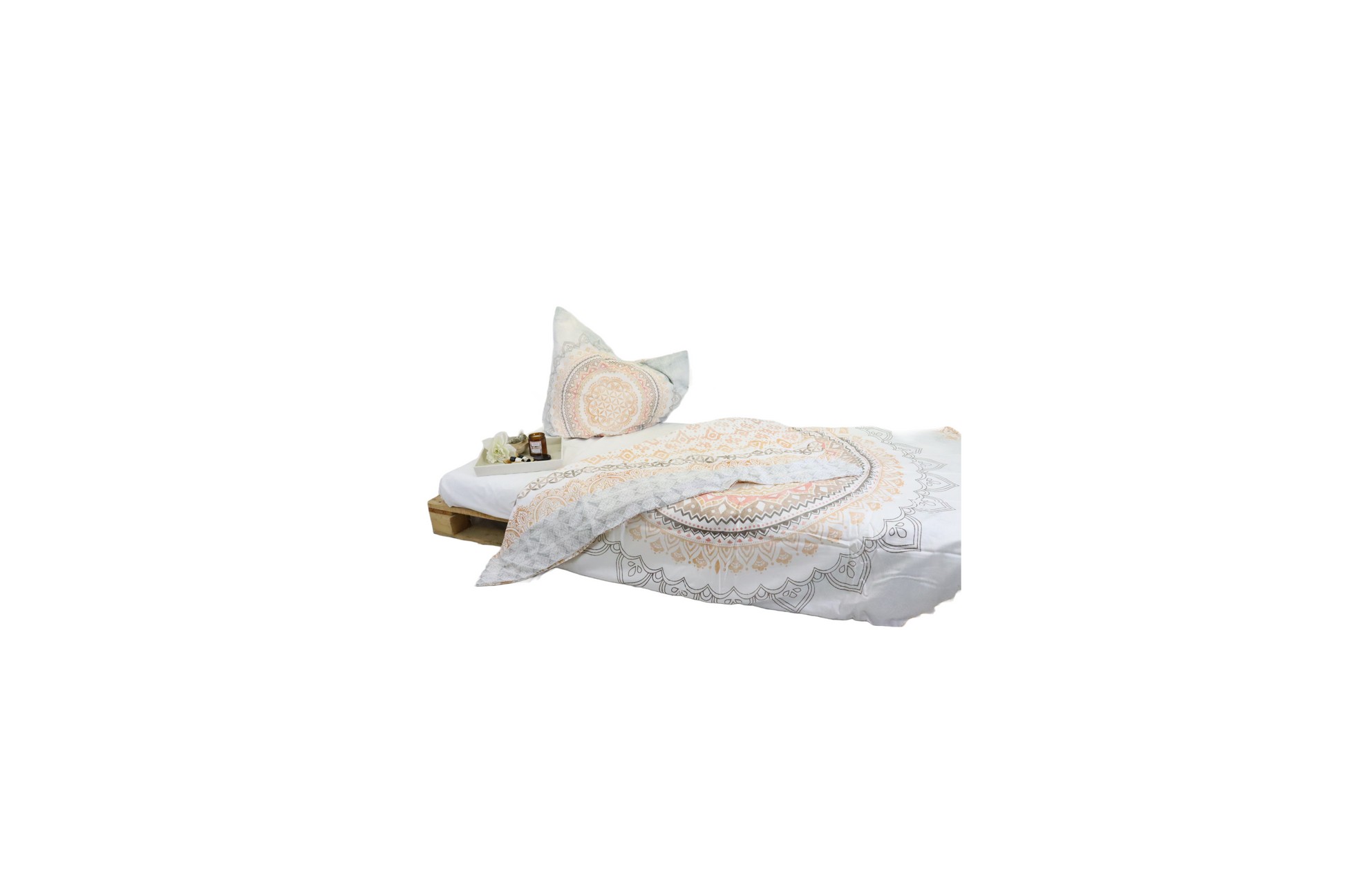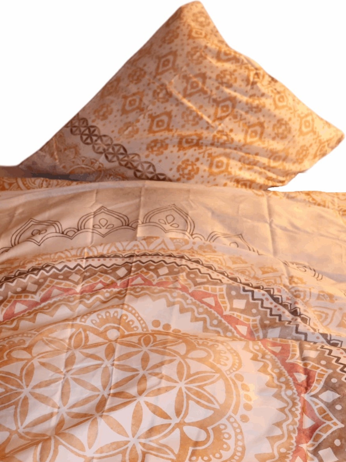 Egal ob Langschläfer(in), Frühaufsteher(in), Traumtänzer(in) oder Farbverliebte(r), diese wunderschöne Bettwäsche bringt dir Streicheleinheiten für die Seele und Entspannung mit zarten ayurwedischen Farben. Lass deine Seele scheinen und deine Träume wahr werden! Fang die positiven Schwingungen der Blume des Lebens ein. Das ornamentale Mandala in zarten und warmen Naturtönen und die weiche, hochwertige Bio Baumwolle vermitteln ein Gefühl von Vertrauen, Glück, Erfüllung, Gemütlichkeit und Wohlsein. Hast du Lust auf etwas Neues? Wenn du es schlichter magst, kannst du die Bettwäsche einfach wenden. Lass den zarten Ethno-Print wirken. Dieser zarte Ethno-Print mit mikrofeinem Rosenquarz macht diese Bio-Baumwoll-Bettwäsche einzigartig. Das Zusammenspiel der beruhigenden zarten ayurvedischen Farbtöne unterstützt deinen ausgeglichenen Schlaf, während die ornamentale Mandala in zarten und warmen Naturtönen Mandalas Ruhe und Harmonie fördern.