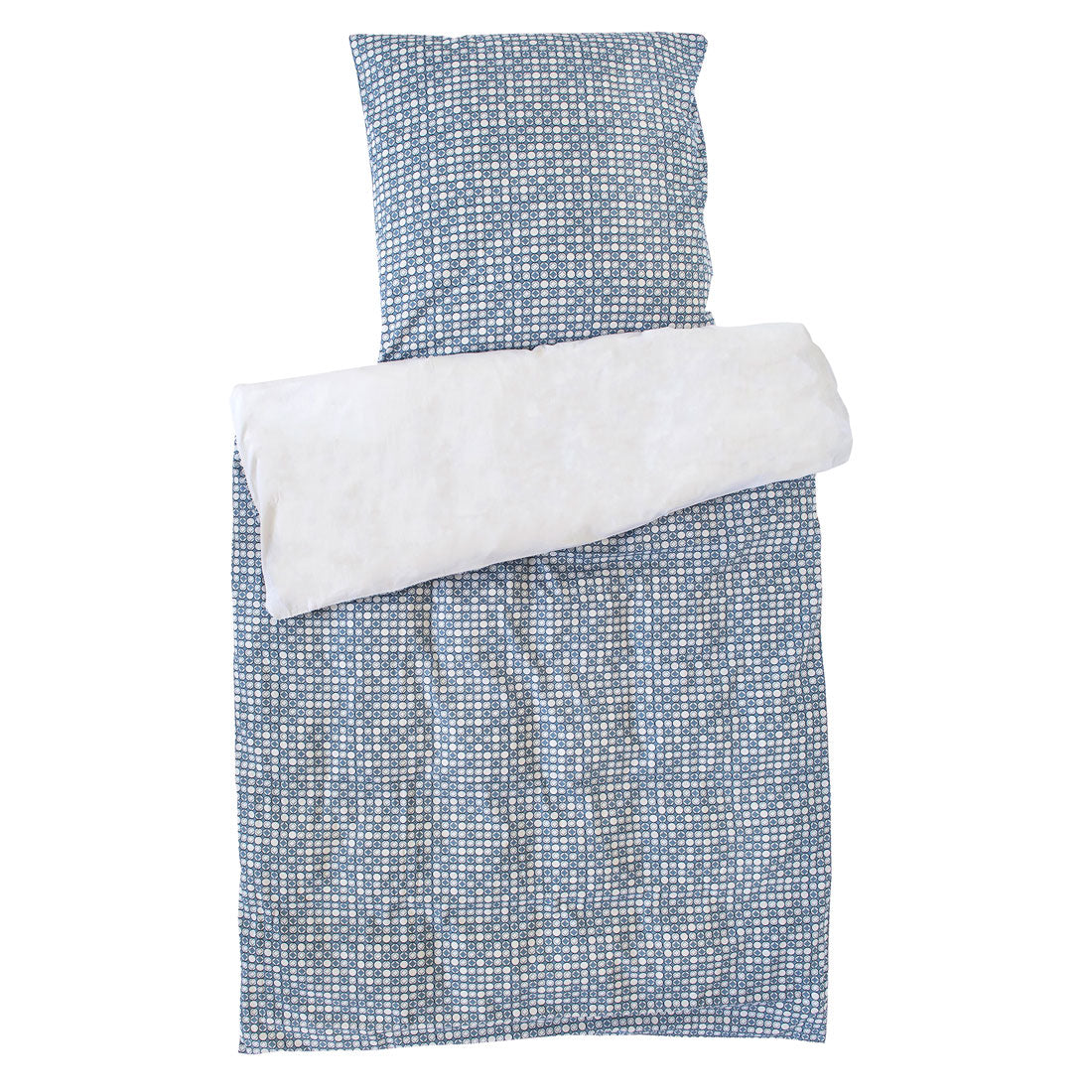 One side printed in different shades of blue, the other side plain white. Closable with high-quality button placket (buttons covered with fabric)