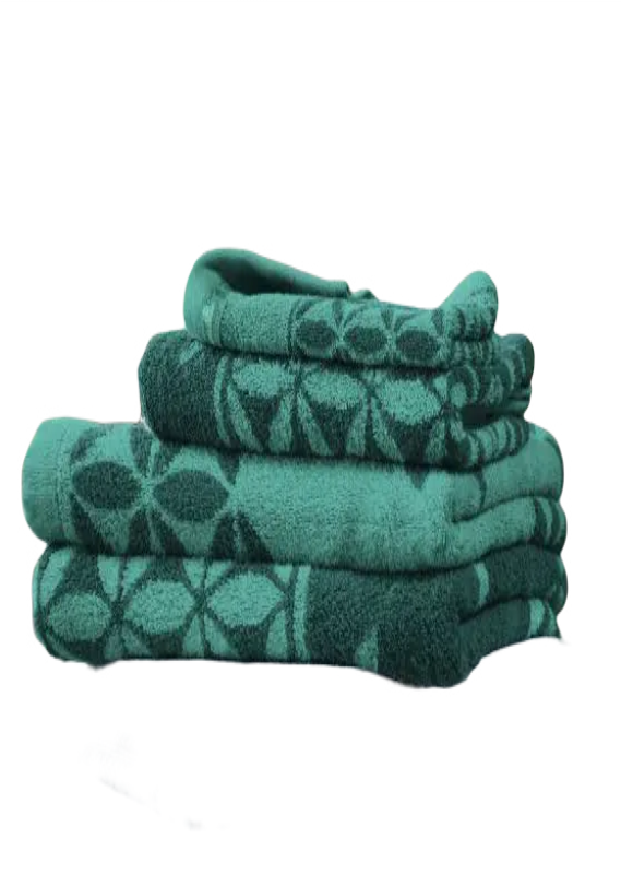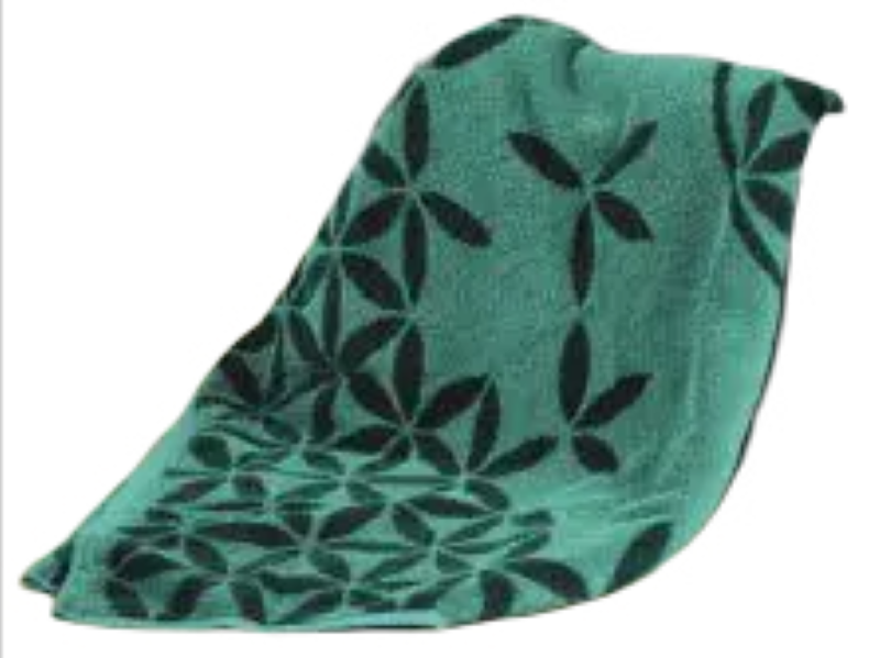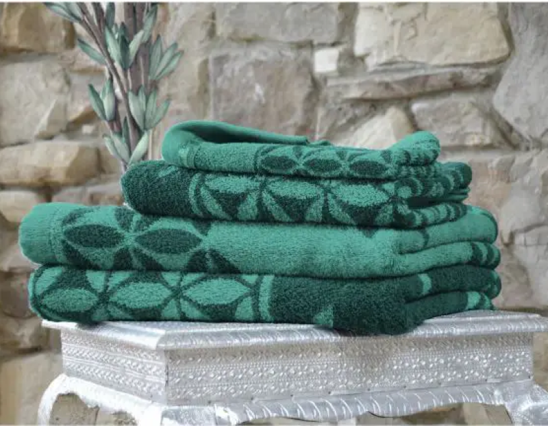 Fengshui terry towels with precious stones sewn into the corners and the motif "Flower of Life" in high/low.