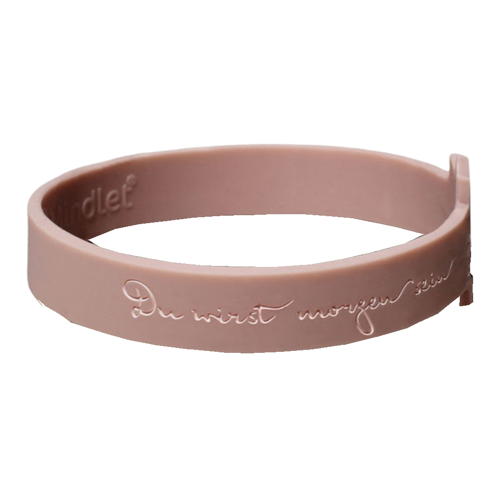 Bitte führe das Mindlet nur so weit über die Hand, dass eine leichte Spannung auf dem Armband liegt. Den Zeigefinger der anderen Hand lege nun an die Innenseite des Armbandes und schiebe es in kreisenden Bewegungen über die Hand, bis es das Handgelenk erreicht. Beim Abnehmen gehe einfach in umgekehrter Reihenfolge wie beim Anlegen vor. Vermeide unnötige Dehnung und Verdrehung des Armbandes.