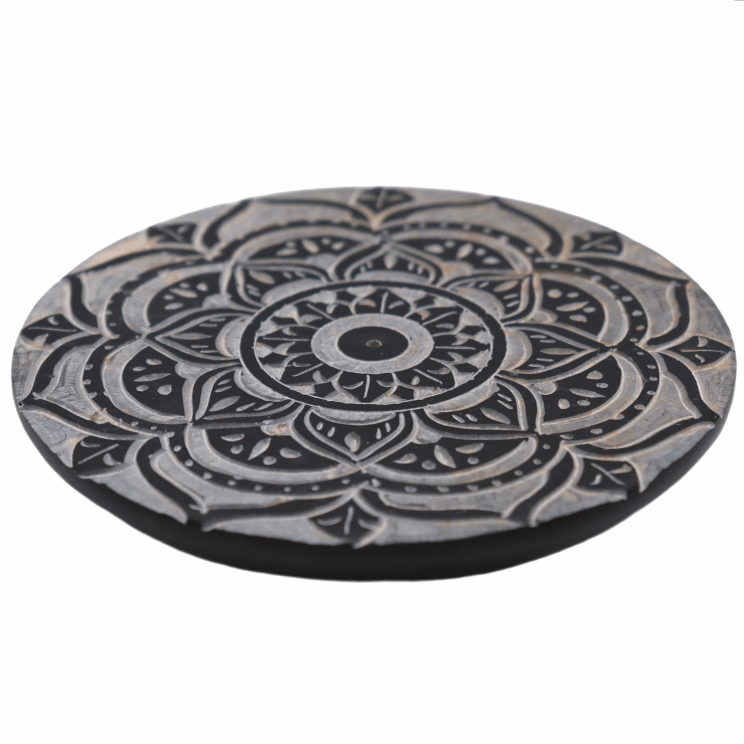 Auf der Oberfläche des Specksteintellers ist ein geometrisches Muster, das Mandala eingraviert. Ein Mandala wird in vielen Kulturen als spirituelles Symbol verwendet. Das Mandala besteht aus einem zentralen Punkt, welcher von symmetrischen Formen umgeben ist. Mandalas werden oft als Meditationshilfe verwendet, denn sie helfen dir ins Gleichgewicht zu kommen und geben dir das Gefühl der Entspannung und Gelassenheit mit. In der Mitte des Tellers befindet sich ein Loch, welches zur Halterung deines Räucherstäbchens dient, während der Teller, dank seiner feuerfesten Eigenschaft, die herabfallende Asche/ Glut auffängt.