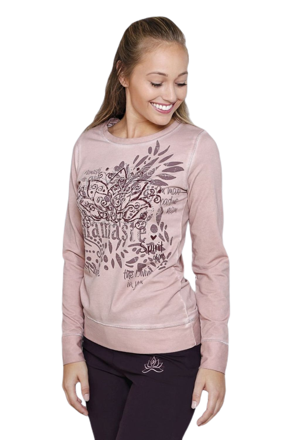 Ein wunderbar weicher Bio-Baumwoll-Stoff, ein schöner Lotus-Namasté-Print mit Glanz- und Nietendetails und dazu eine effektvolle Pigment-Färbung in modischer Farbstellung wird Sie begeistern.
